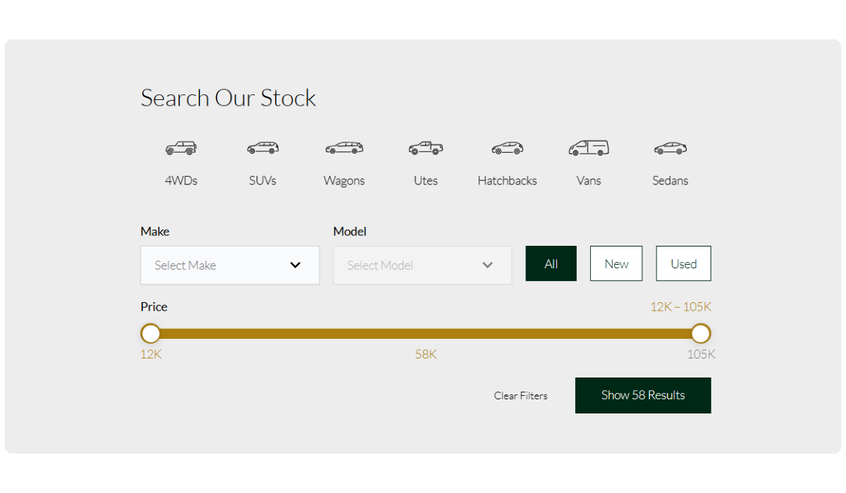 Our analytics demonstrate that 61% of customers conduct searches using Make, Model, and Price filters, with only 39% utilising the remaining search fields. To streamline the website experience and increase vehicle listing views, we’re simplifying the search interface to focus on these primary interactions, making it quicker and easier for customers to find their vehicles. Mobile devices benefit from this change greatly, with less fields resulting in an easier to navigate search interface.